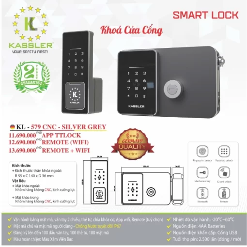 Khóa điện tử Kassler KL-579 CNC Silver Grey Remote + Wifi dành cho cổng ngoài trời, chống nước, an ninh cao, phân phối bởi SmartLock MH. Khóa cổng vân tay 2 chiều Kassler KL-579 CNC Silver Grey Remote + Wifi chống nước ngoài trời, phân phối chính hãng SmartLock MH, bảo hành 2 năm. Khóa cổng thông minh Kassler KL-579 CNC Silver Grey – khóa vân tay 2 chiều, hỗ trợ app TTLock quản lý từ xa qua điện thoại.