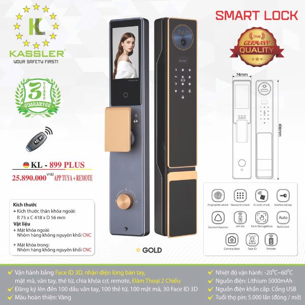 Khóa Cửa Thông Minh Kassler KL-899 Plus – App Tuya+ Remote | Face ID 3D Cao Cấp 2025